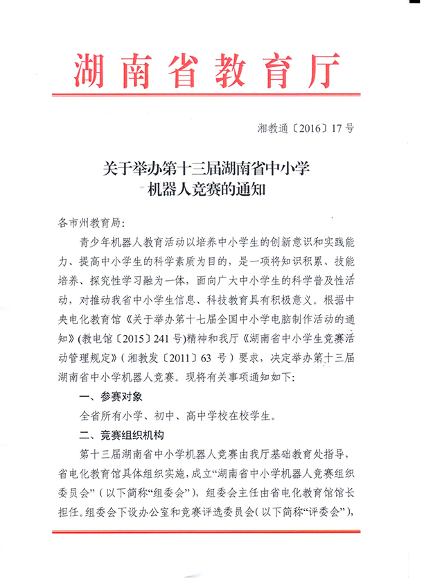 关于举办第十三届湖南省中小学机器人竞赛的通知