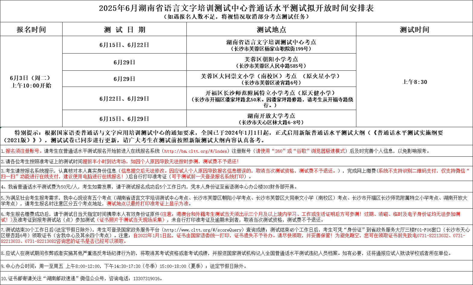 2025年6月湖南省语言文字培训测试中心普通话水平测试开放时间安排表