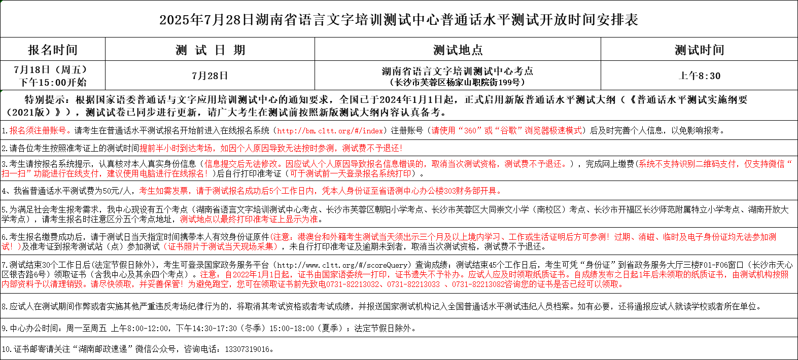 2025年7月28日湖南省语言文字培训测试中心普通话水平测试开放时间安排表